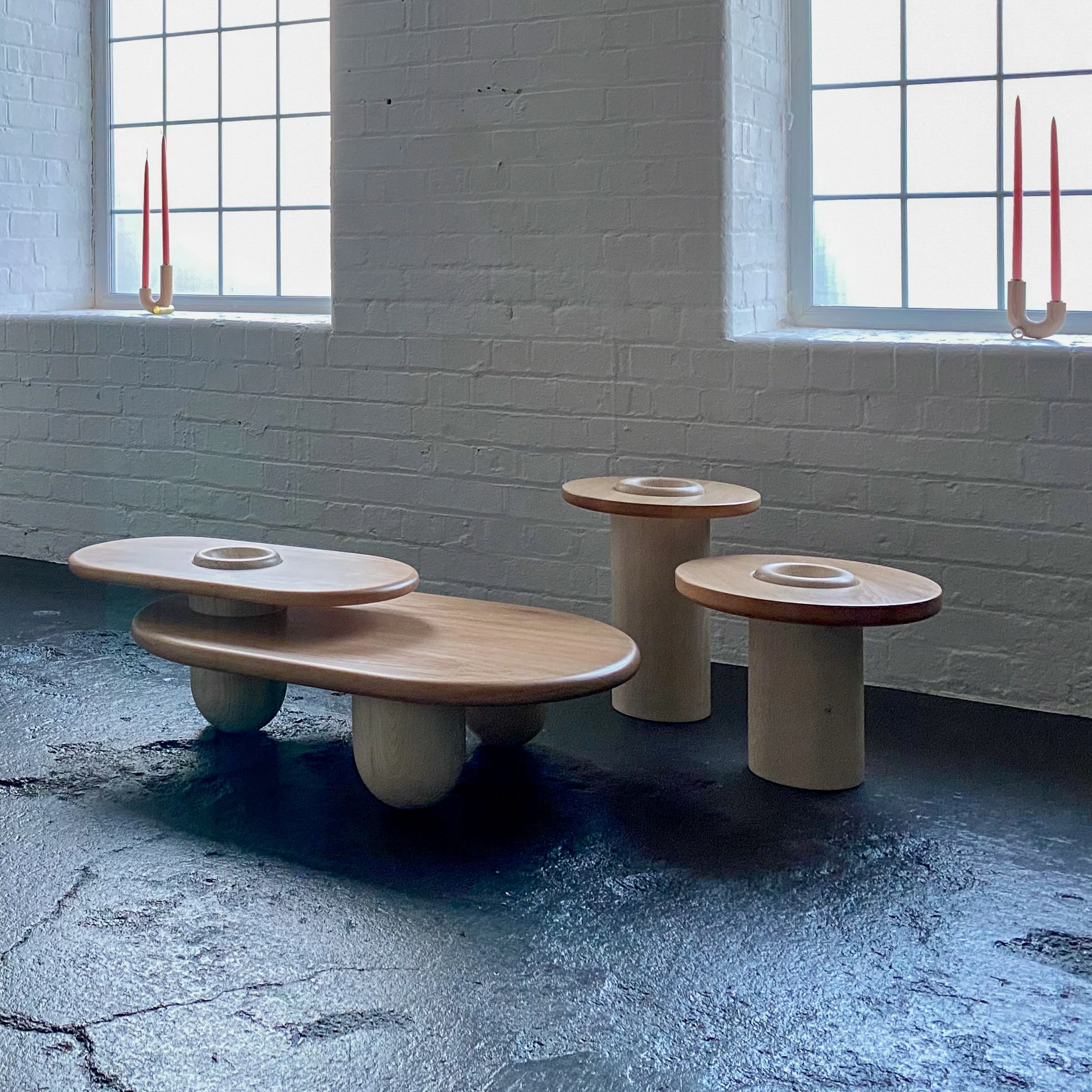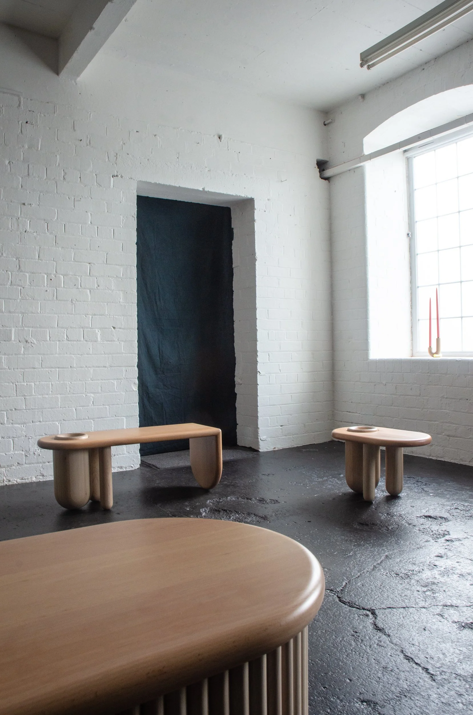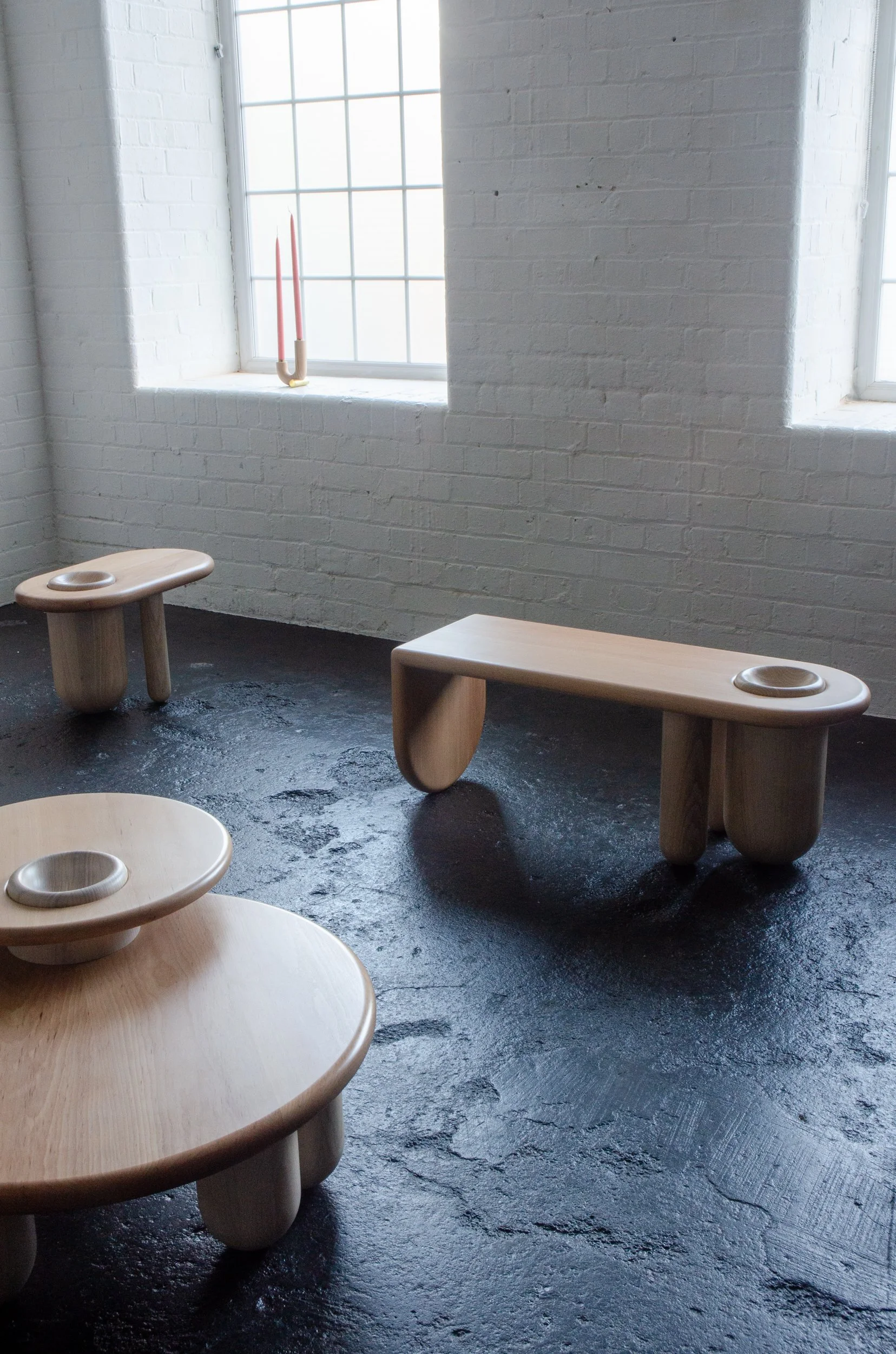 Domovoy can be roughly translated to ‘household lord’, and is a spirit God that inhibits the home and cares for its family. In attempts to appease the Domovoy, it was tradition for family members to leave an offering of food to show caring behaviours. Domo takes this ritual of offering and family care and places it at the centre of the collection. Each piece has a bowl providing an integral space for sharing, placing nurture and order at the centre of the furniture’s function.